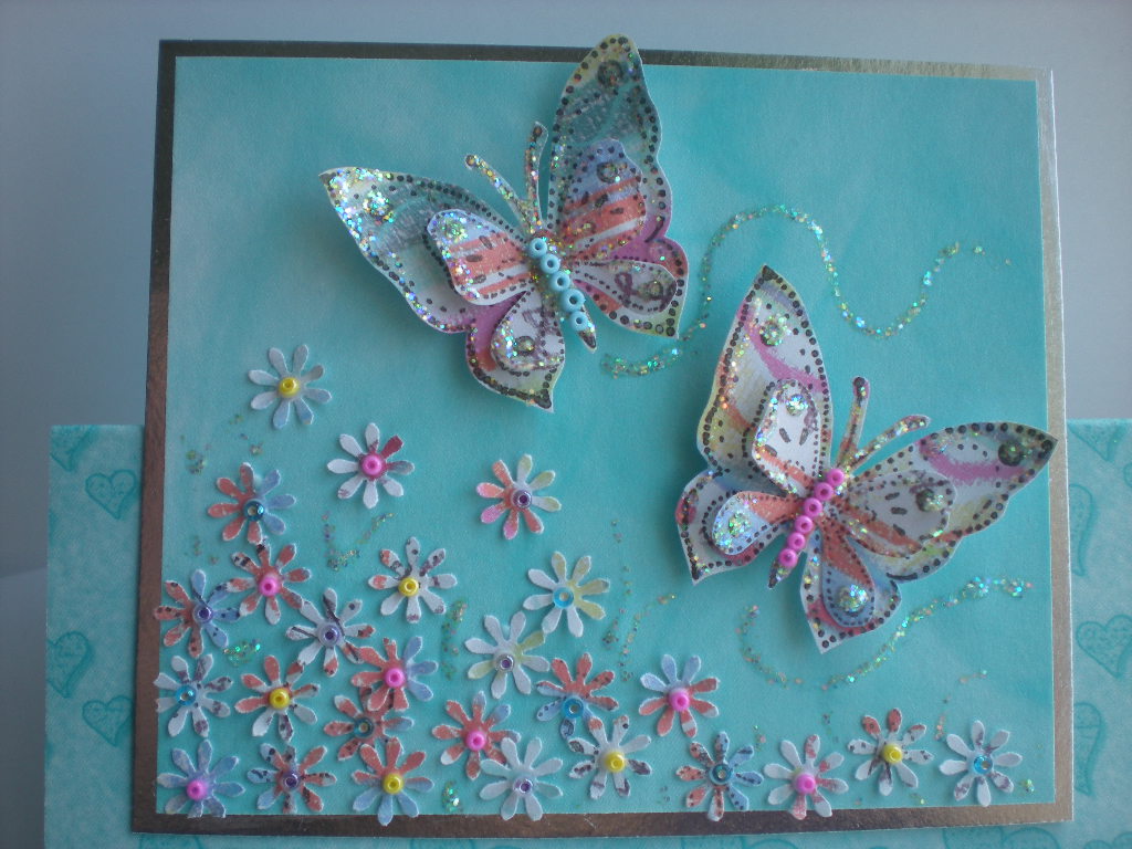 I used the same butterfly stamp onto some very pretty patterned paper..layered up and glittered as before but added some beads along the centre this time. I used a tiny daisy punch with the same paper and added a flower bed for the butterflies to be hovering above.